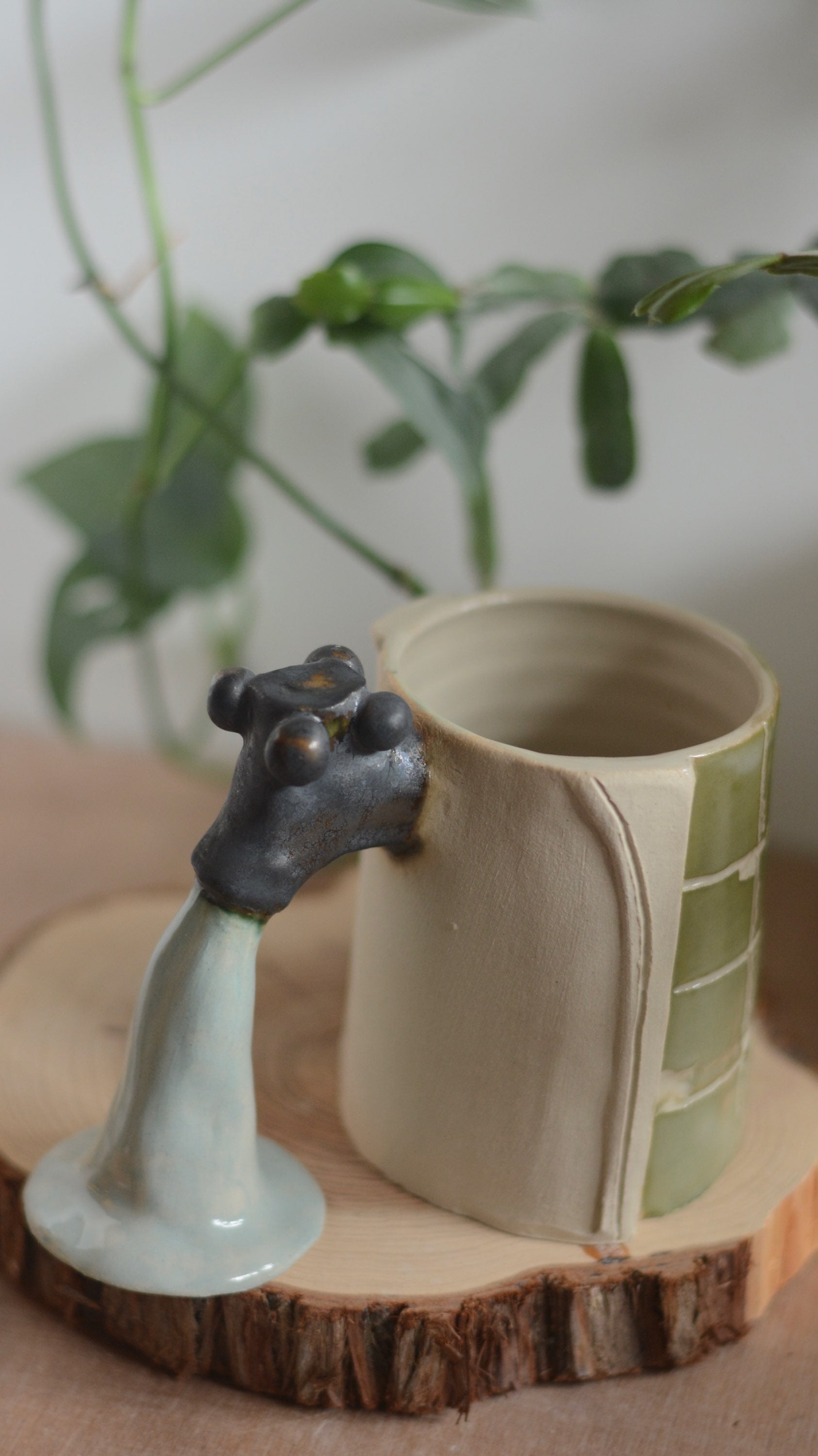 Pièce crée pendant le challenge "claytober". Pièce unique en grès blanc façonnée et décorée à la main puis émaillée en transparent.
