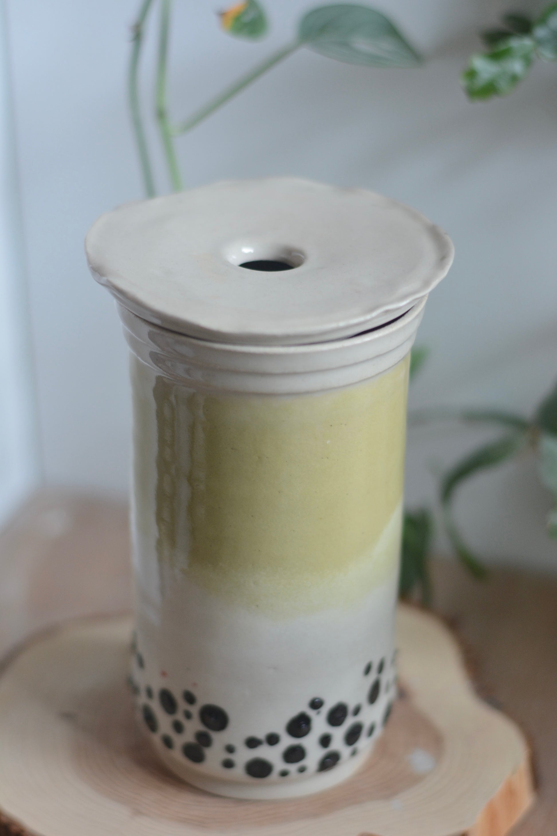 Pièce crée pendant le challenge "claytober". Pièce unique en grès blanc façonnée et décorée à la main puis émaillée en transparent.