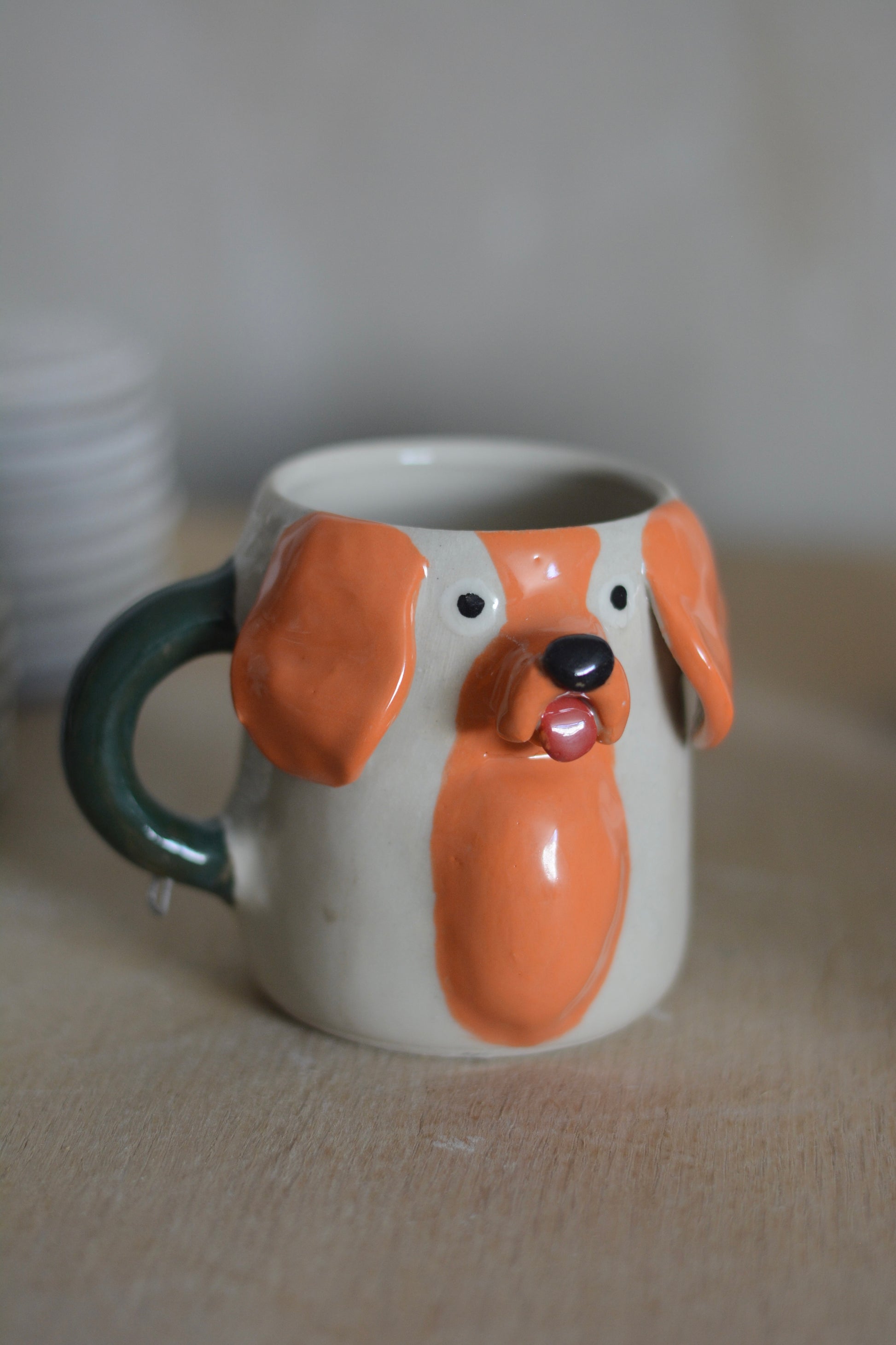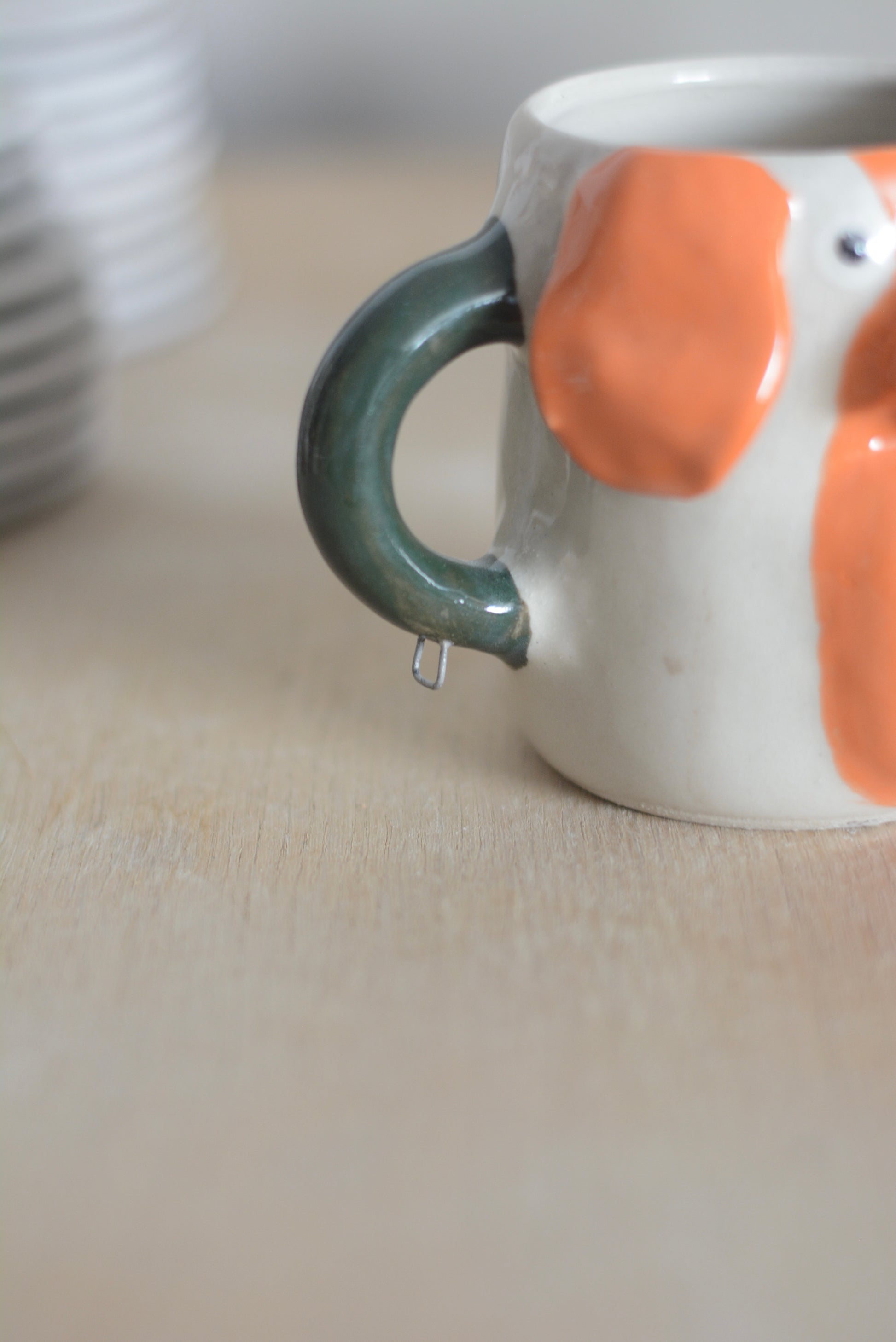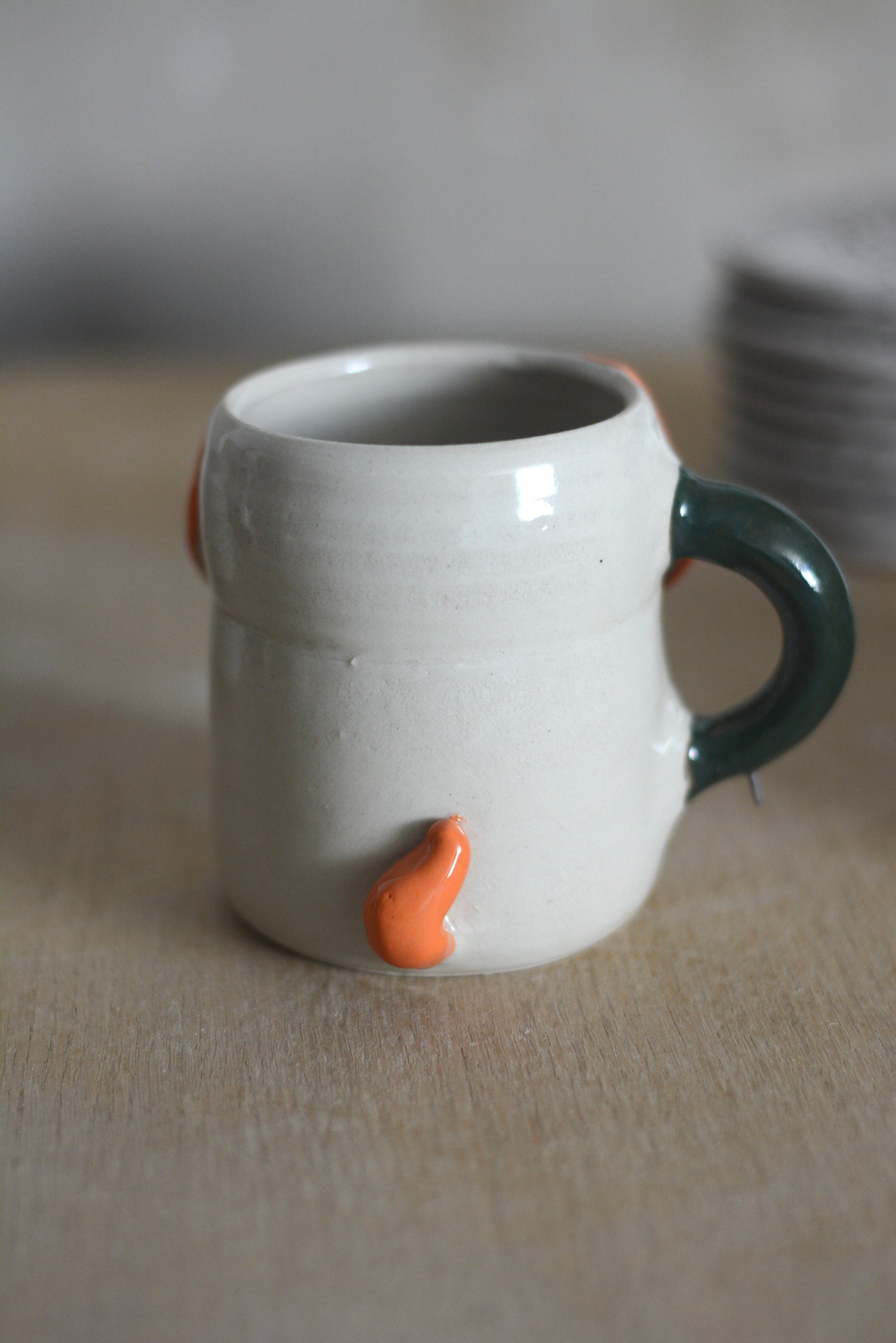 Mug en grès blanc tourné et décoré à la main, puis émaillé en transparent.