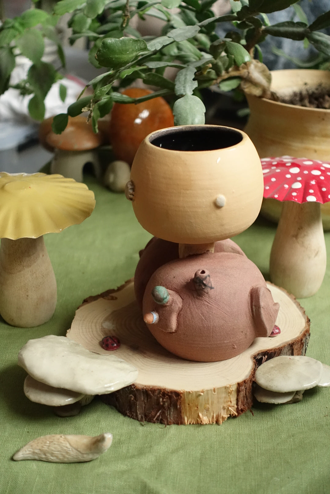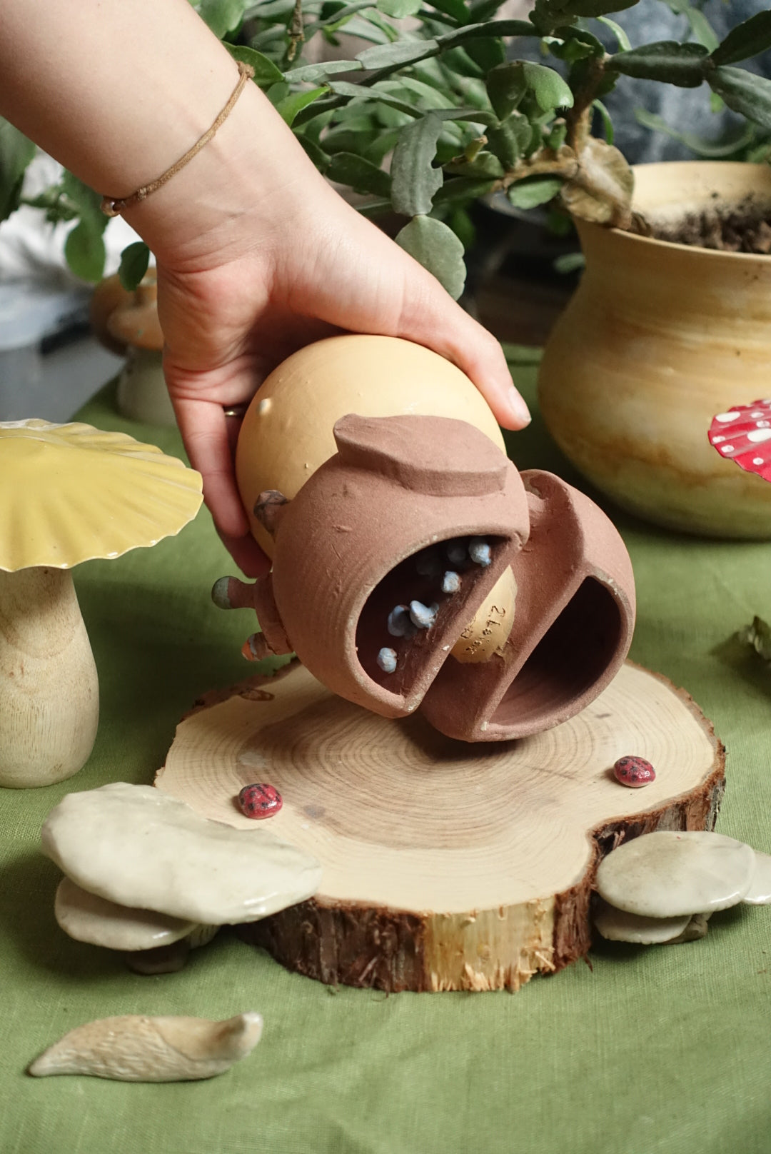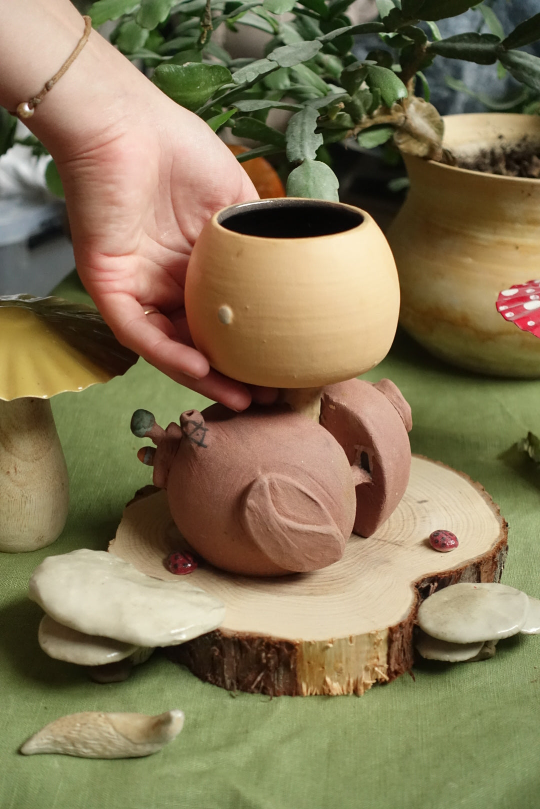 Pièce en grès roux tournée et décorée à la main puis émaillée en transparent brillant.