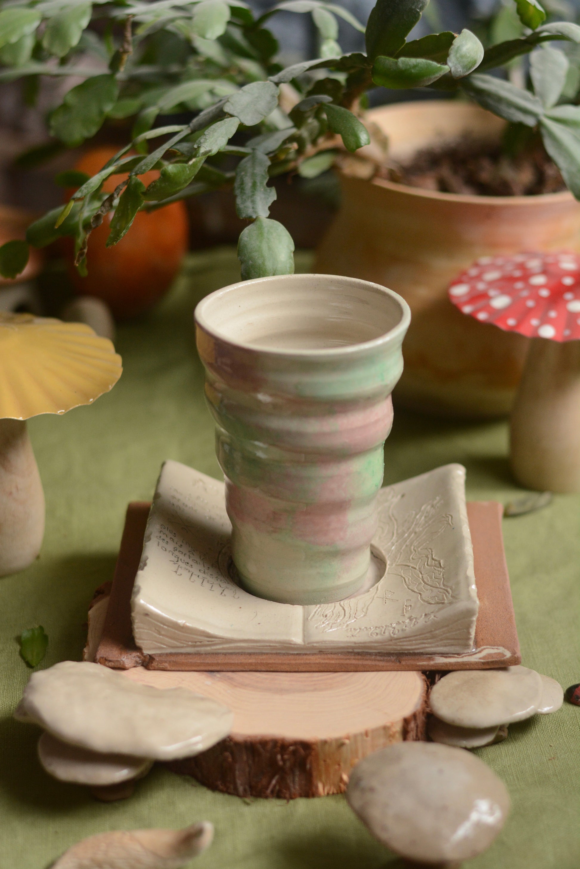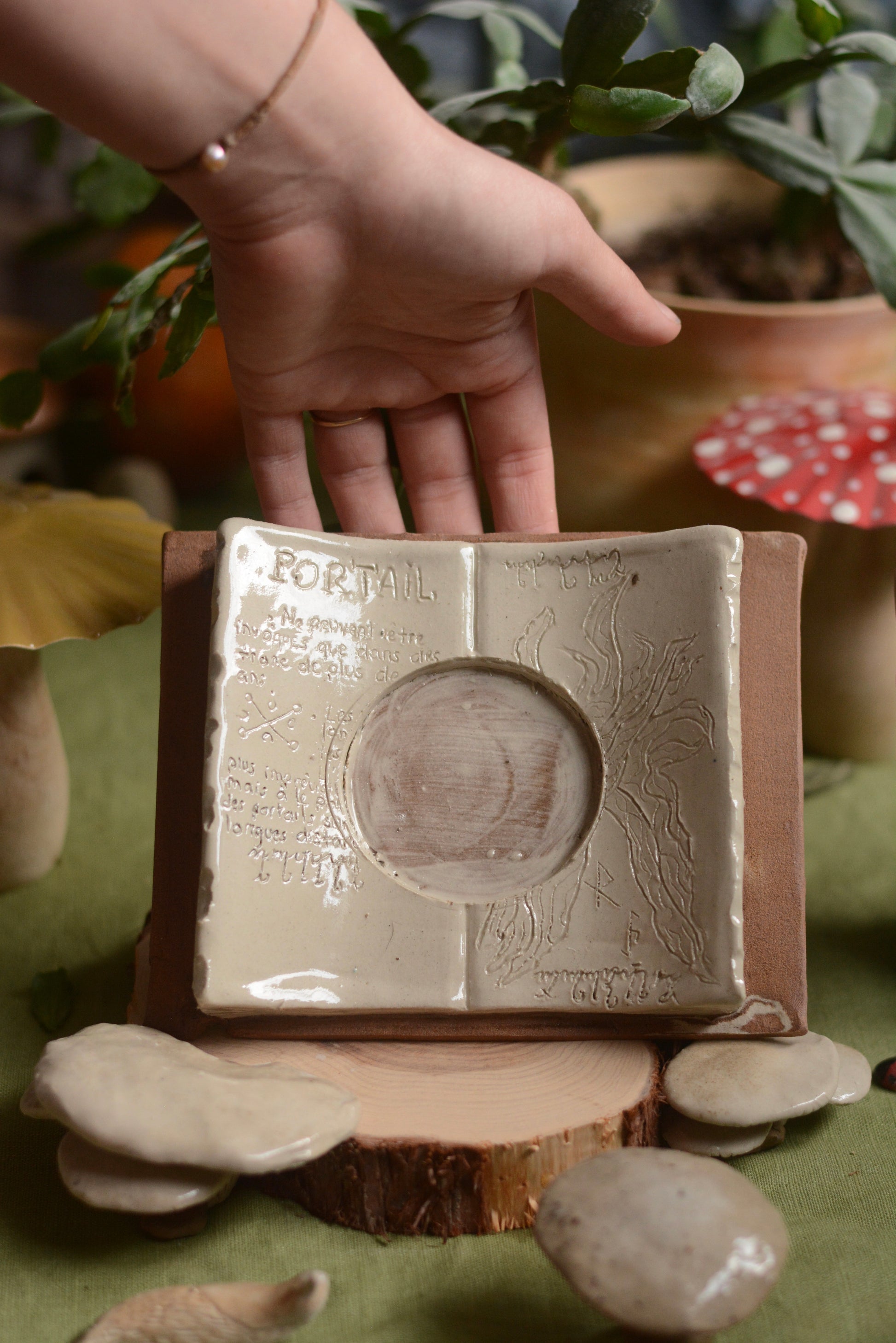 Pièce en grès blanc et roux tournée et décorée à la main puis émaillée en transparent brillant.