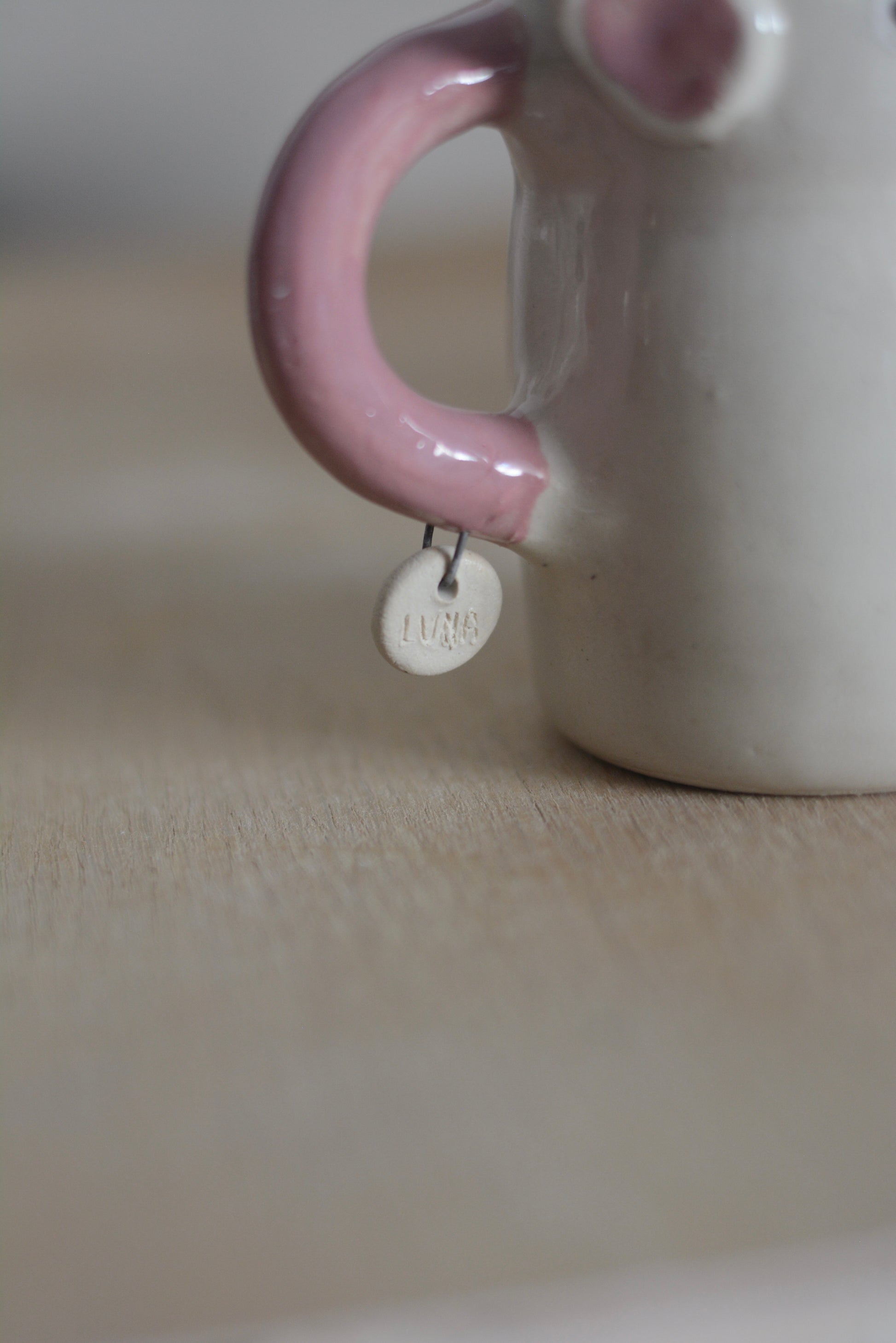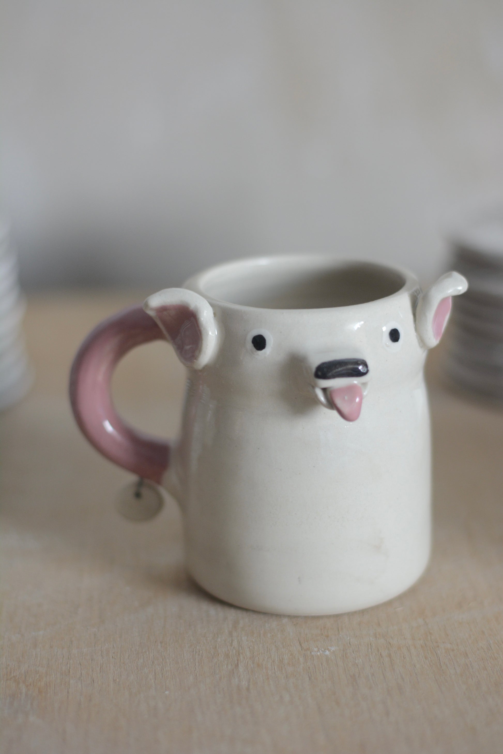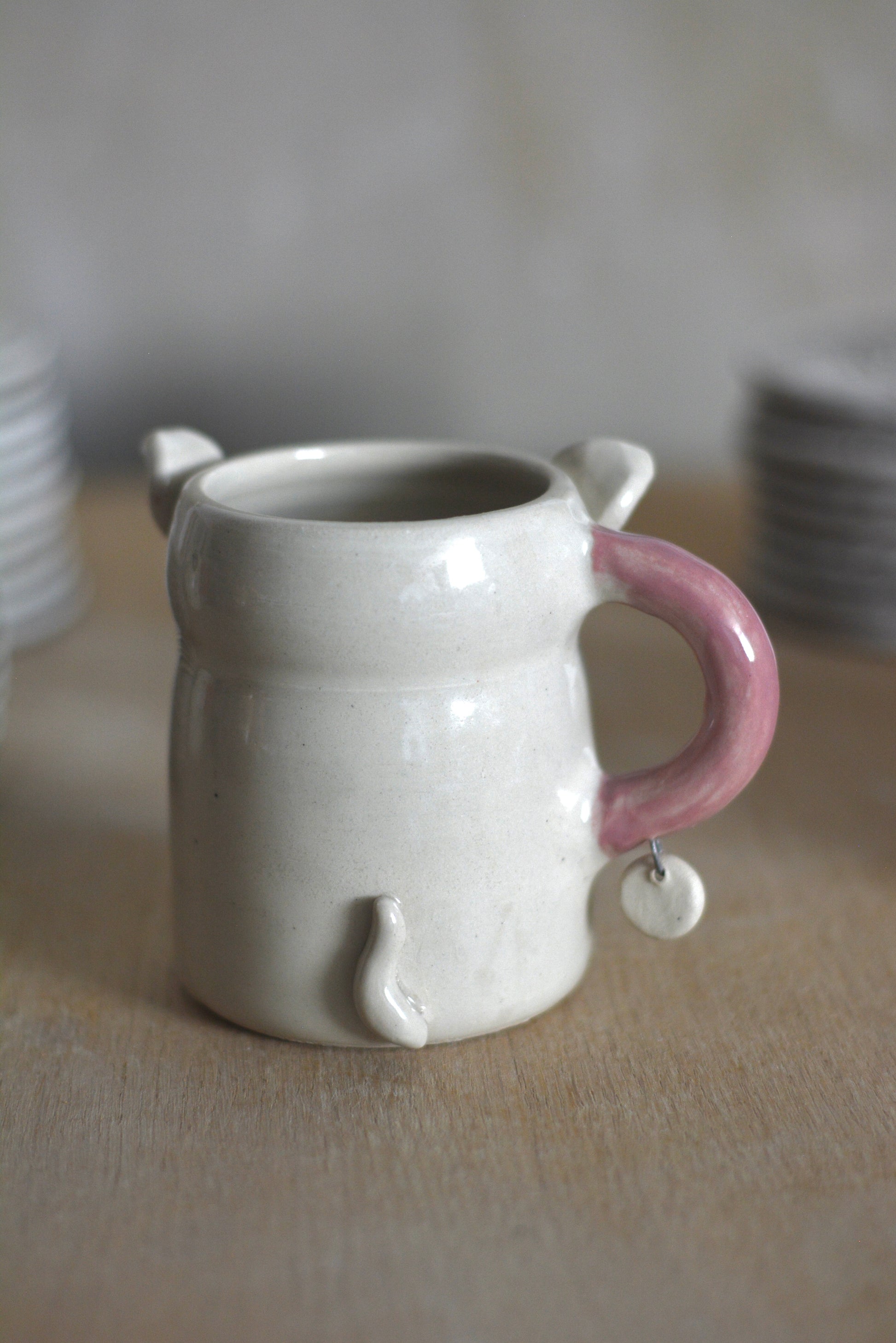 Mug en grès blanc tourné et décoré à la main, puis émaillé en transparent.
