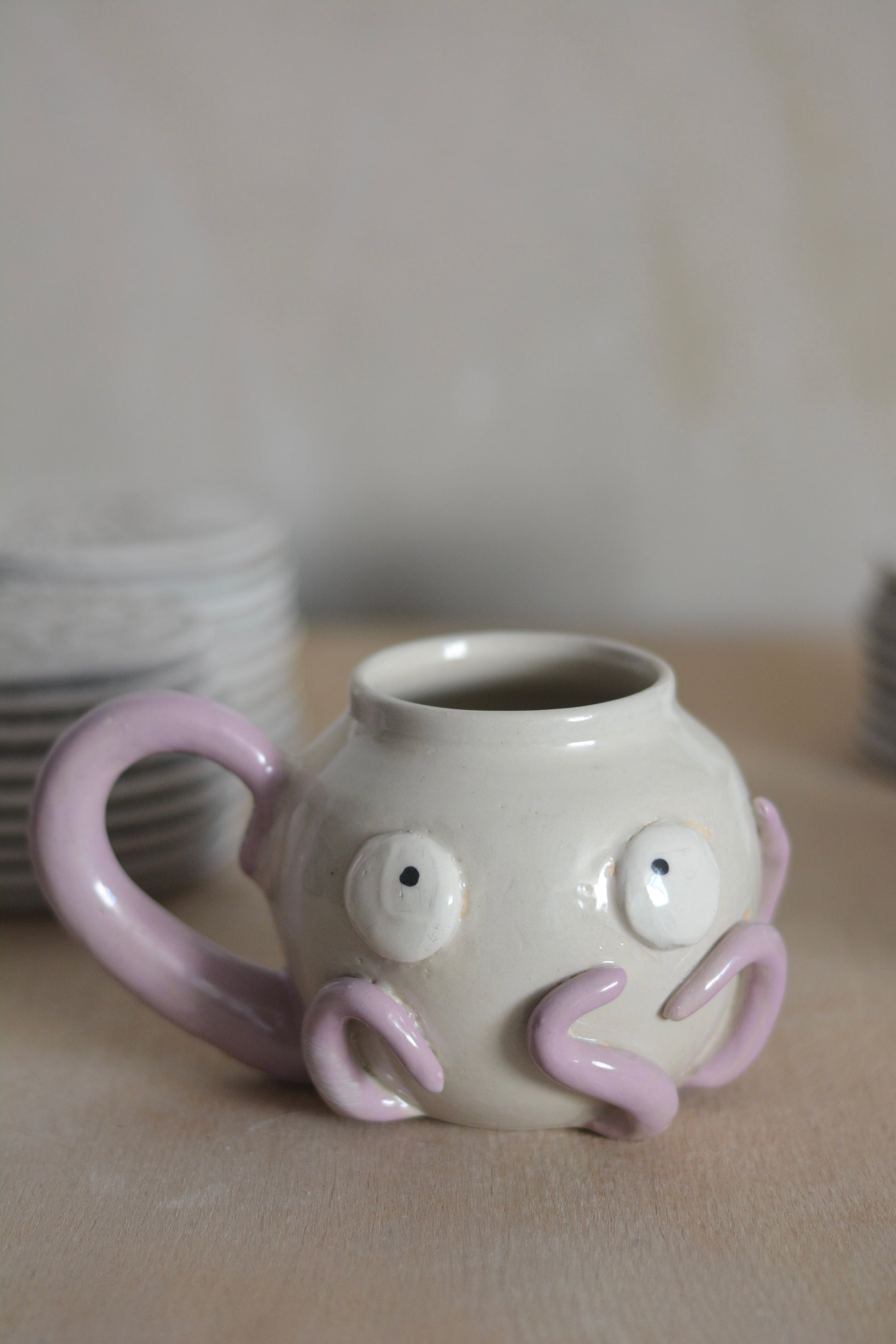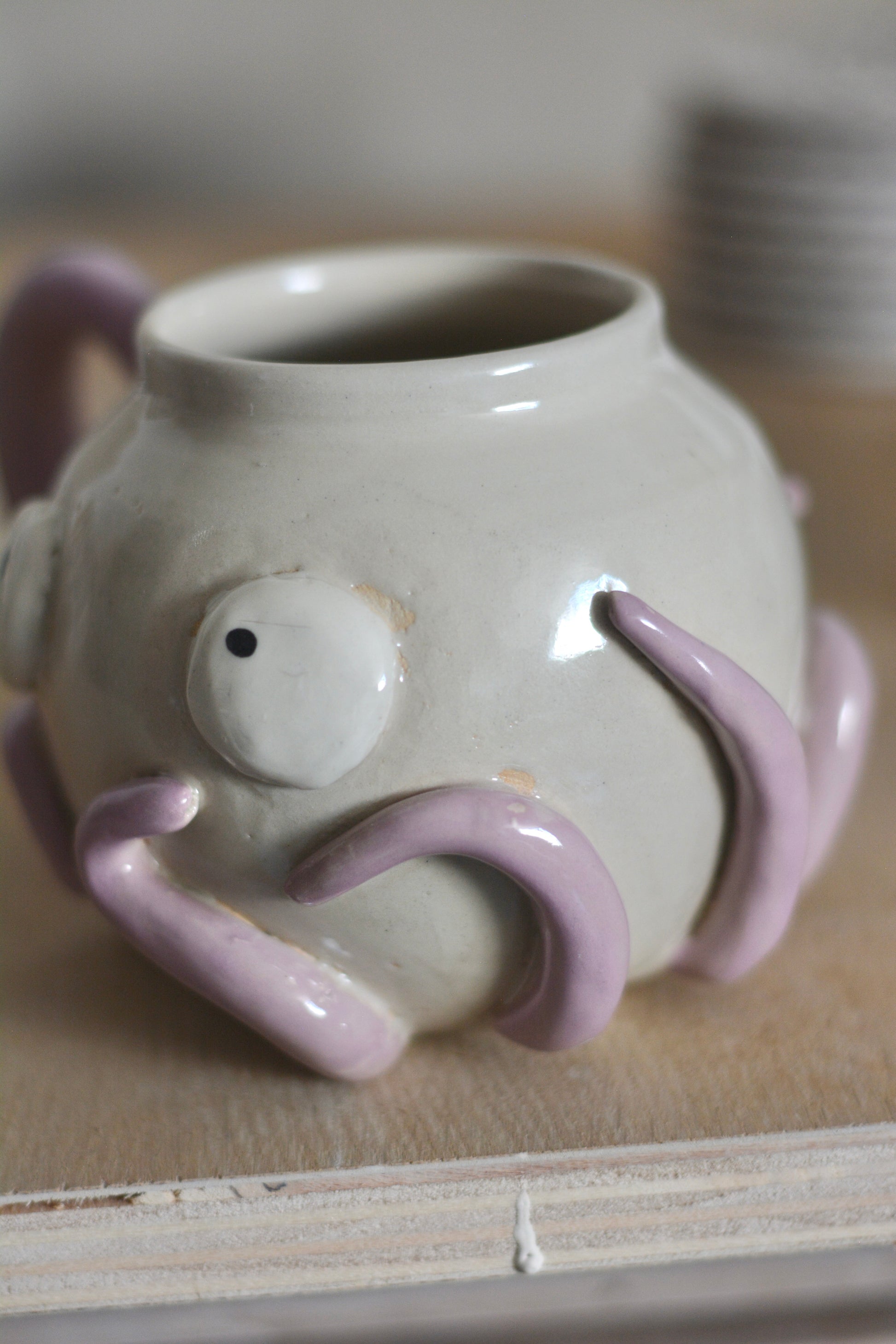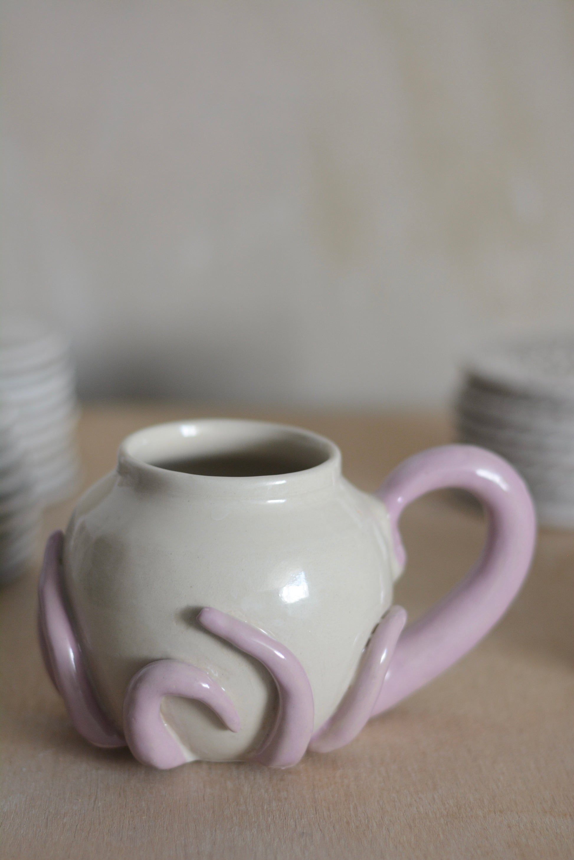 Mug en grès blanc tourné et décoré à la main, puis émaillé en transparent.