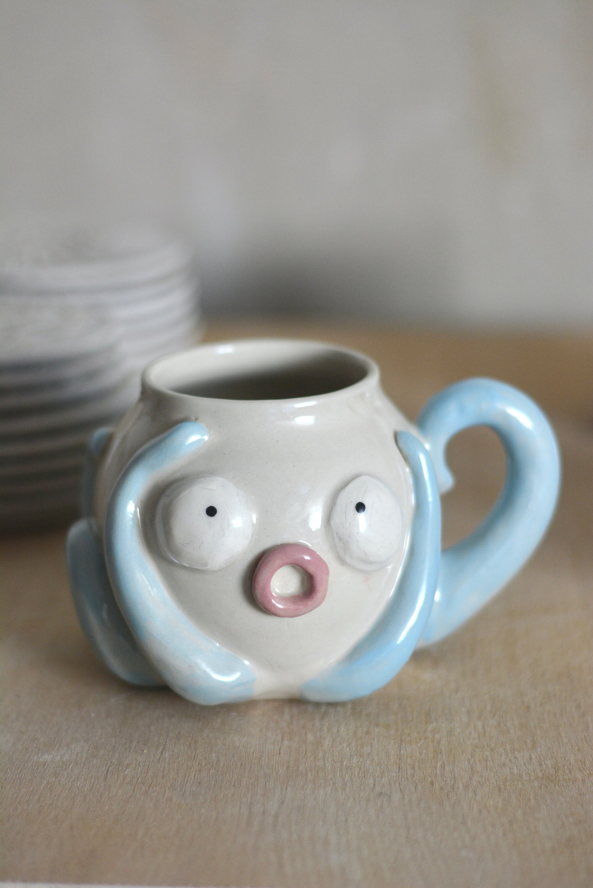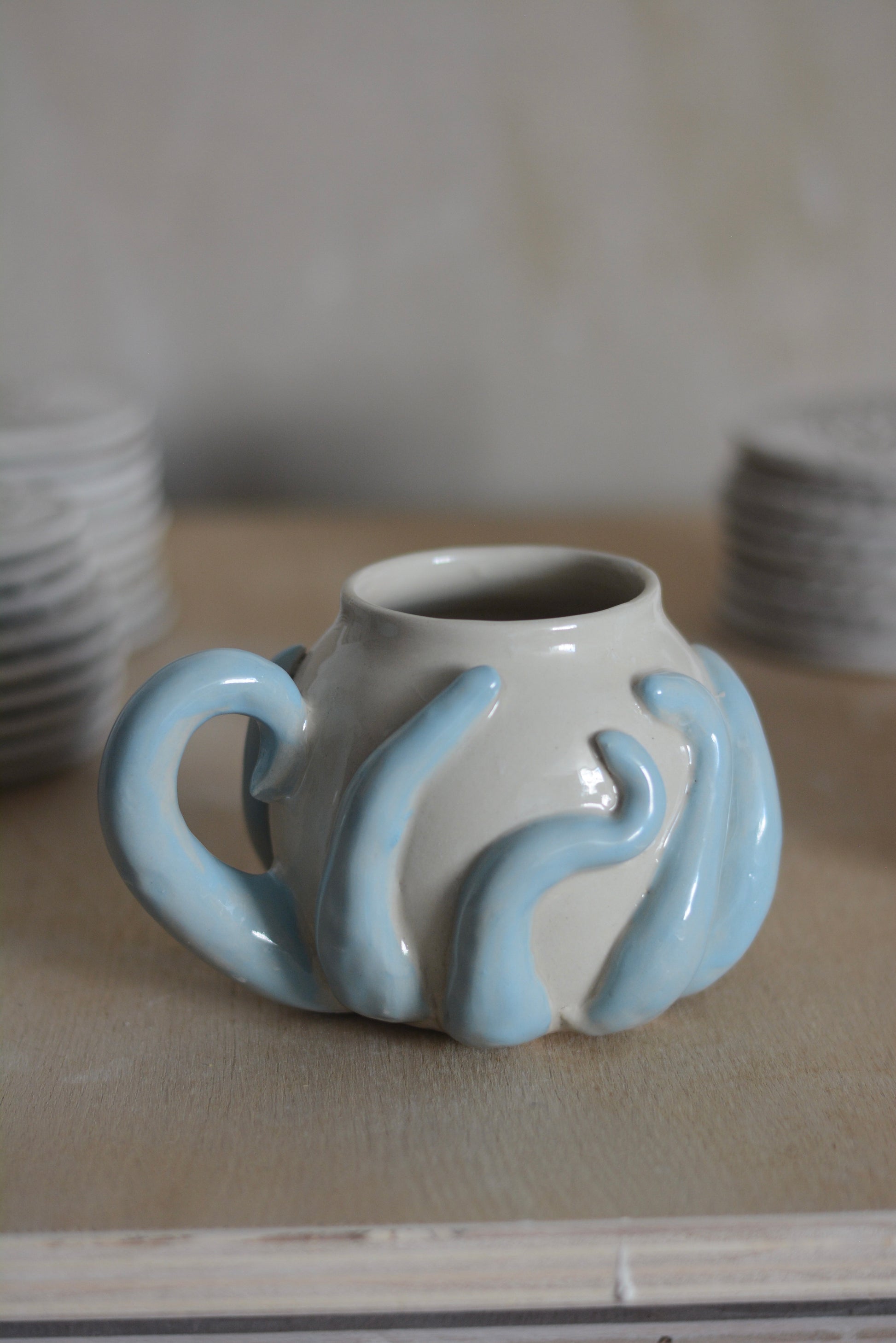 Mug en grès blanc tourné et décoré à la main, puis émaillé en transparent.