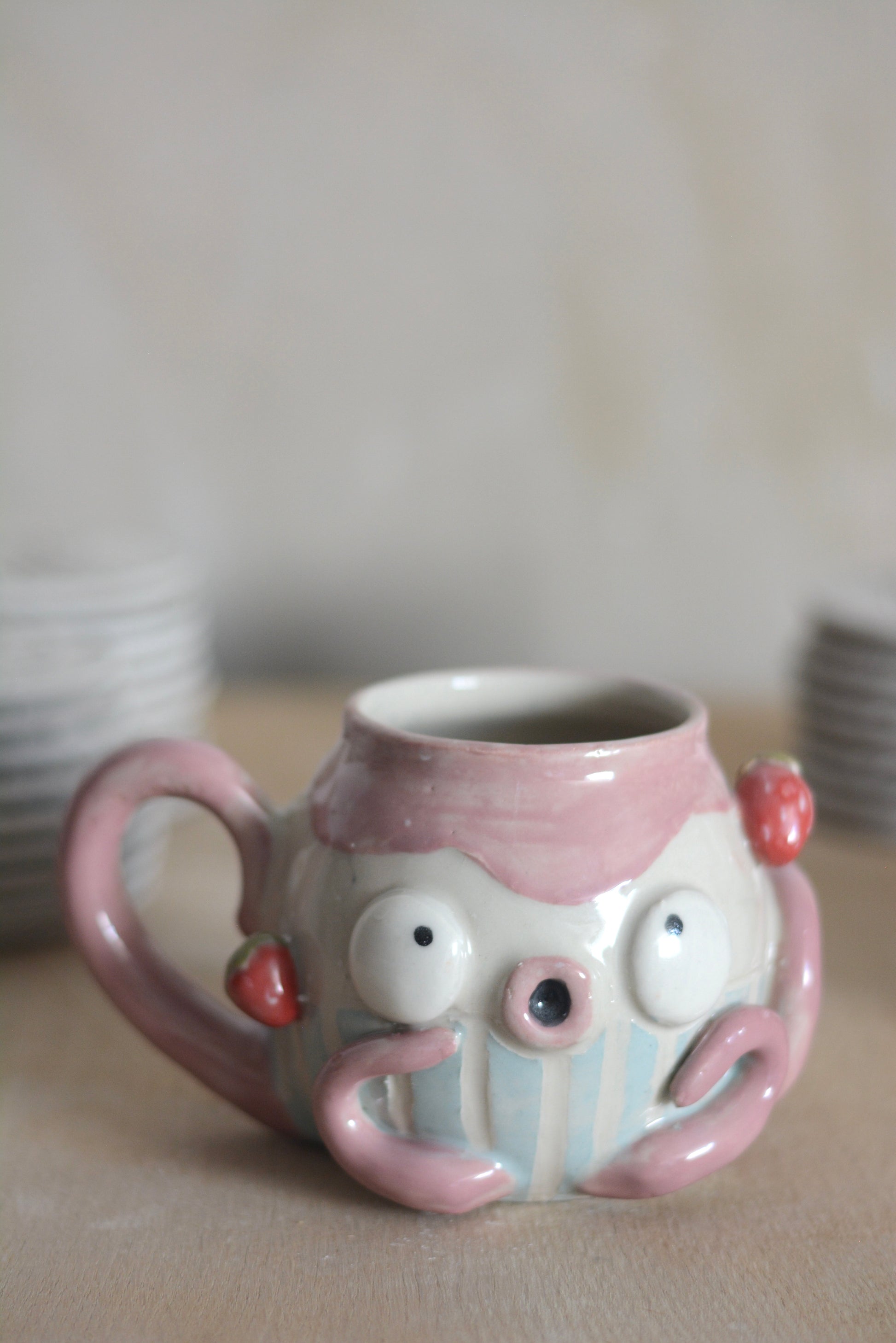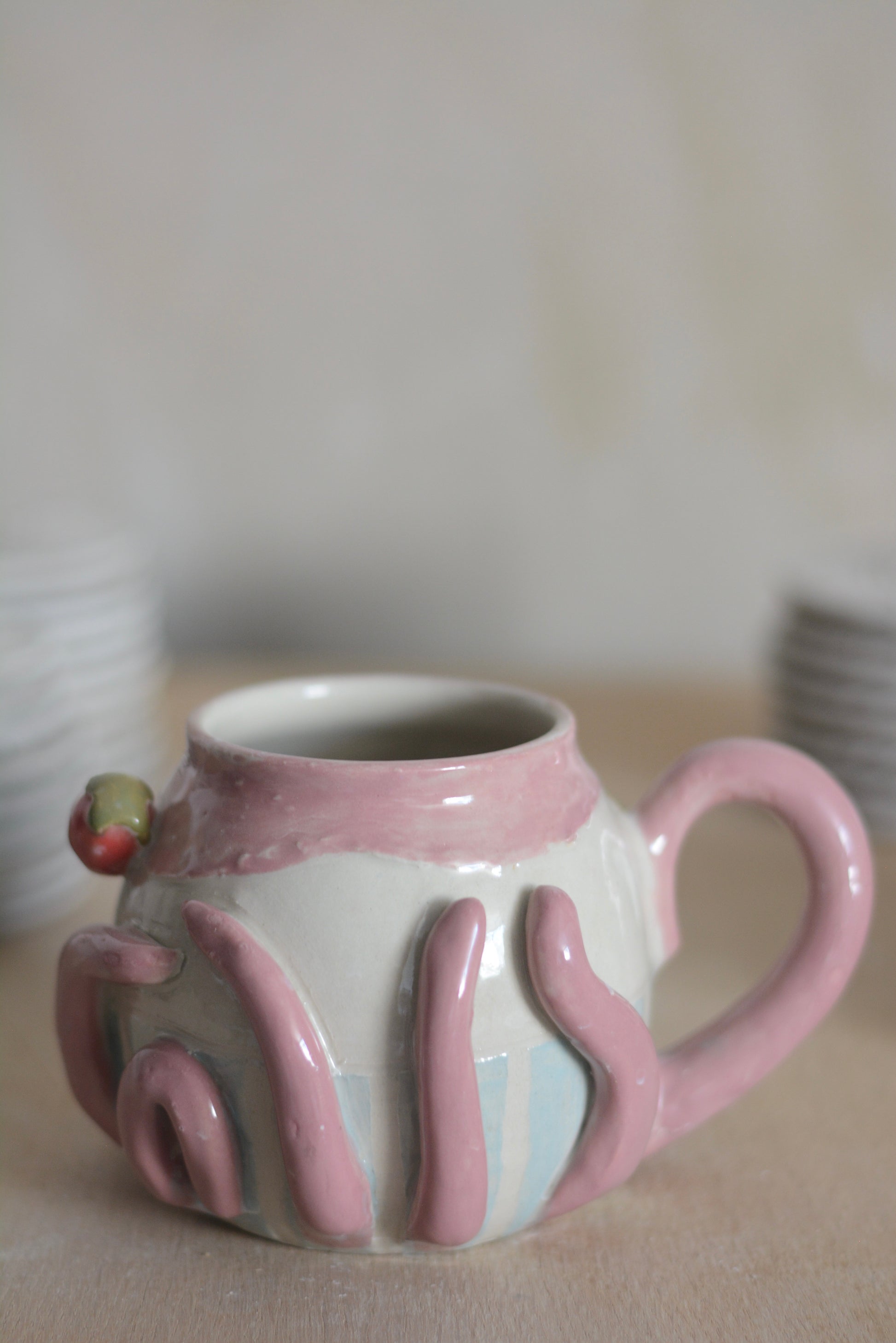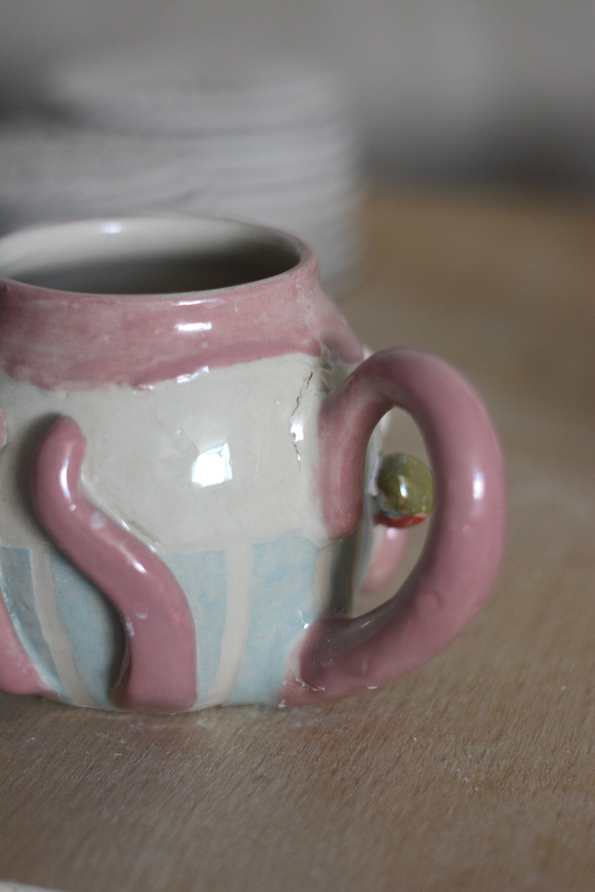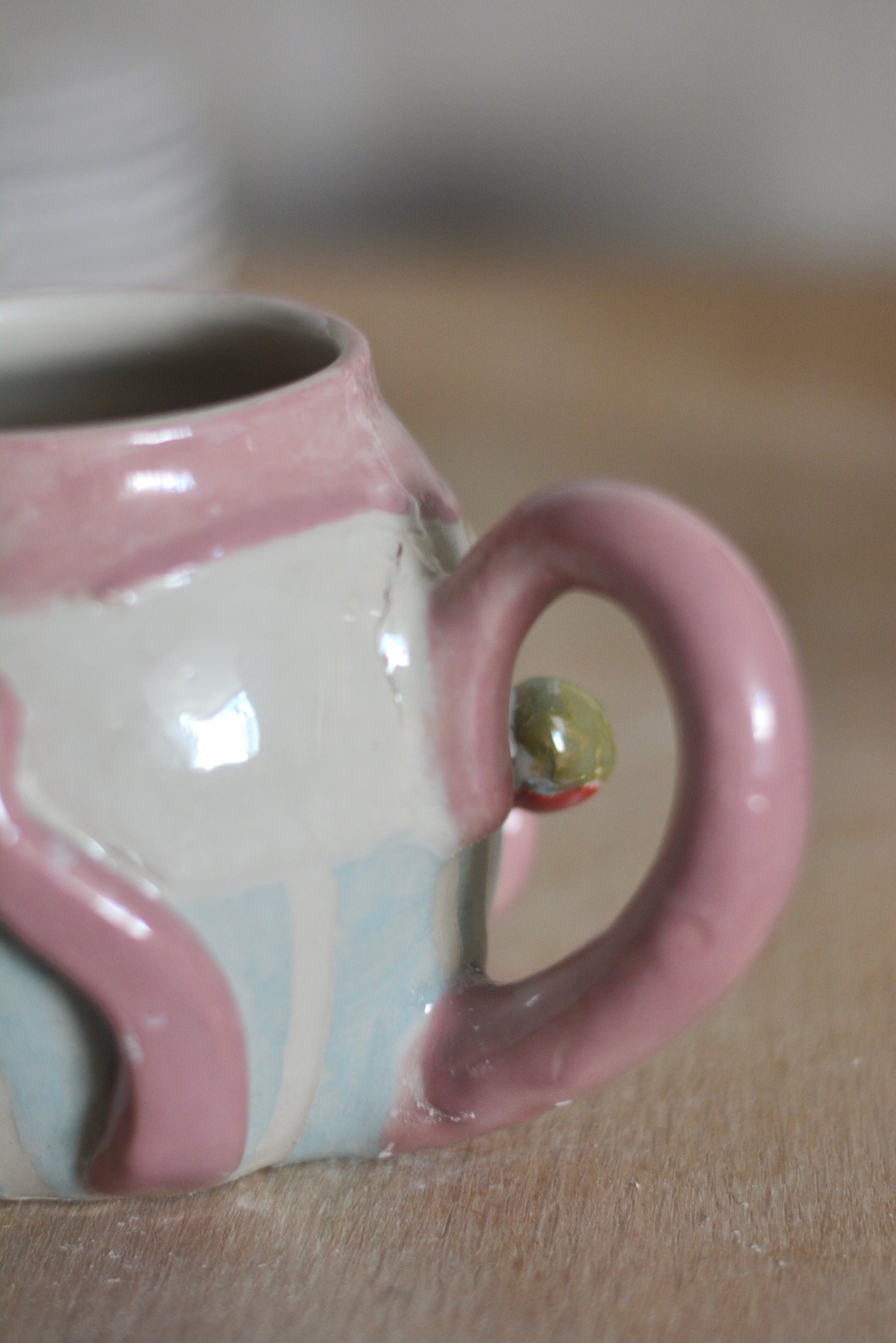 Mug en grès blanc tourné et décoré à la main, puis émaillé en transparent.
